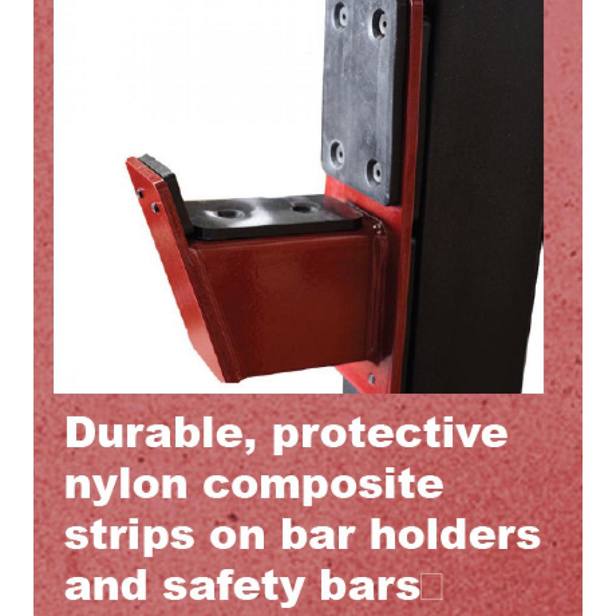 - Reinforced Safety: 26″ long safety bars with double-reinforced upright connections, along with protective nylon strips, ensure added safety during workouts.